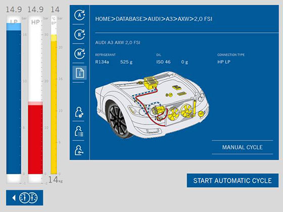 Equipped with a 15-inch touch display, the ADS 130 allows quick selection of automatic and manual service functions as well as built-in diagnostic tools. Automatic workflows optimise the replacement of A/C components, reducing service and repair time — saving your workshop time, money, and resources.